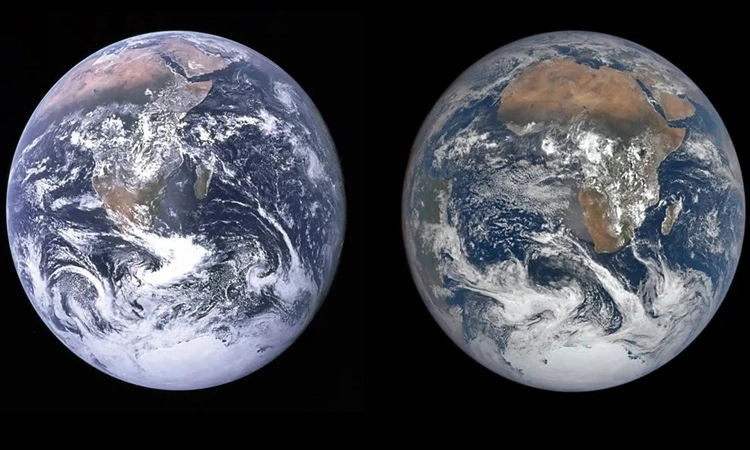 Bức ảnh Viên bi xanh (trái, năm 1972) và sau 50 năm (phải, năm 2022). Ảnh: NASA