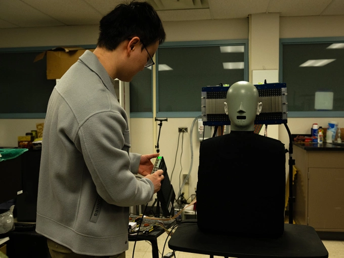 Jia-Xin Zhong sử dụng hình nộm với microphone gắn trong tai để đo lường sự hiện diện của âm thanh dọc theo đường truyền siêu âm. Ảnh: Poornima Tomy/Penn State