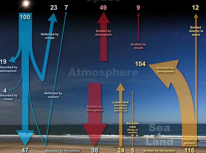 Trái Đất liên tục nhận năng lượng từ Mặt Trời sau đó phản xạ năng lượng đó trở lại không gian, trong đó mây có tác dụng làm ấm và làm mát trong quá trình này. Ảnh: NOAA