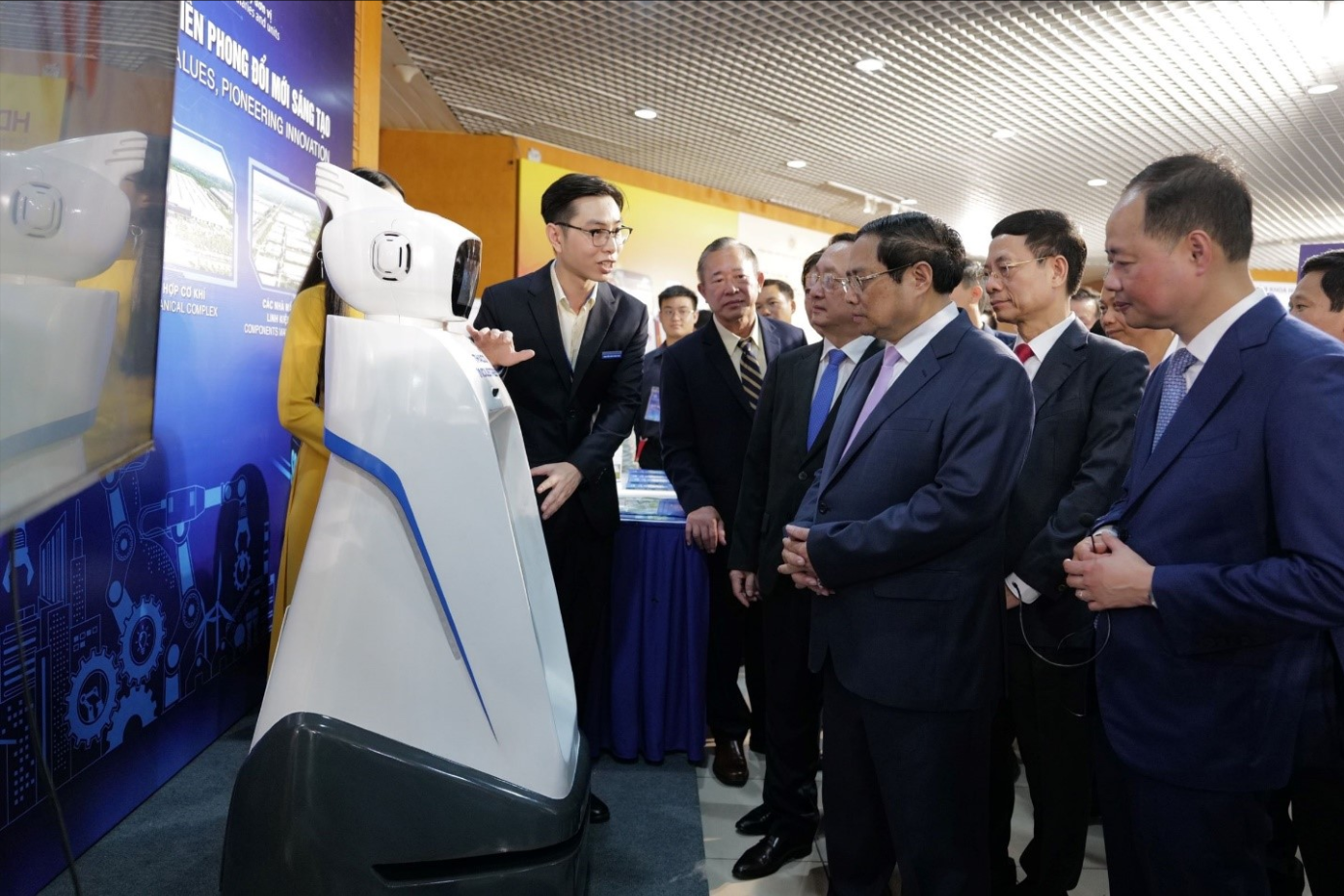 Ông Phạm Văn Tài (hàng đầu, bên trái) giới thiệu đến Thủ tướng và lãnh đạo bộ, ngành tại Ngày Khoa học và Công nghệ Việt Nam 2024. Ảnh: Thaco