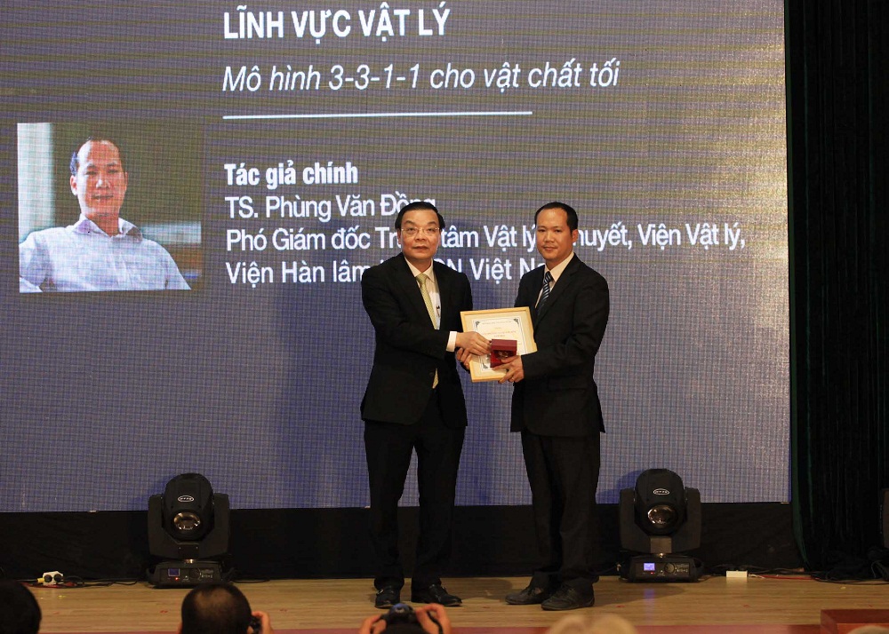 Bộ trưởng Bộ khoa học và công nghệ Chu Ngọc Anh (bên trái) trao Giải thưởng Nhà khoa học trẻ có công trình khoa học xuất sắc cho TS. Phùng Văn Đồng, Viện Vật Lý, Viện Hàn Lâm khoa học và công nghệ Việt Nam (bên phải)