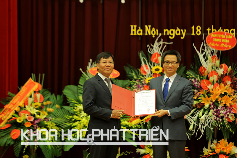 Phó thủ tướng Vũ Đức Đam trao Quyết định của Thủ tướng Chính phủ về bổ nhiệm Chủ tịch Viện Hàn lâm KHXH Việt Nam cho ông Nguyễn Quang Thuấn.