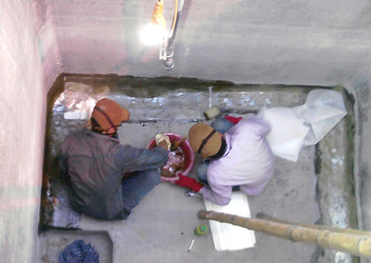 Đội ngũ kỹ thuật Công ty Phúc Tất Đạt đang thi công chống thấm tầng ngầm chứa nước