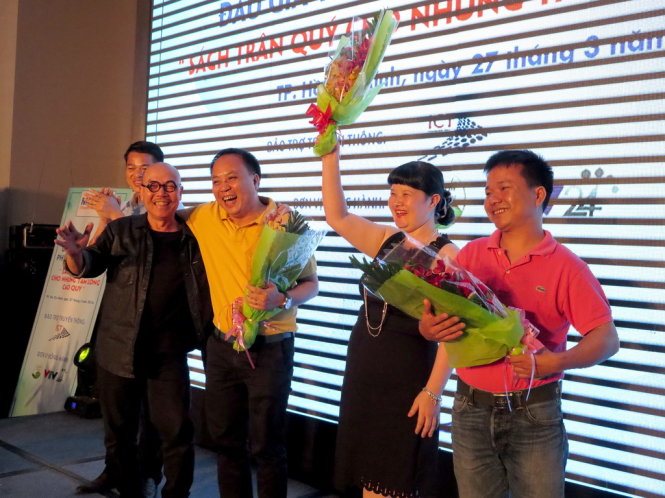 Anh Vinh đeo bám ráo riết và cuối cùng đấu thắng quyển từ điển có bìa là tranh giấy dó của họa sĩ Phan Cẩm Thượng ở mức giá 102 triệu đồng.