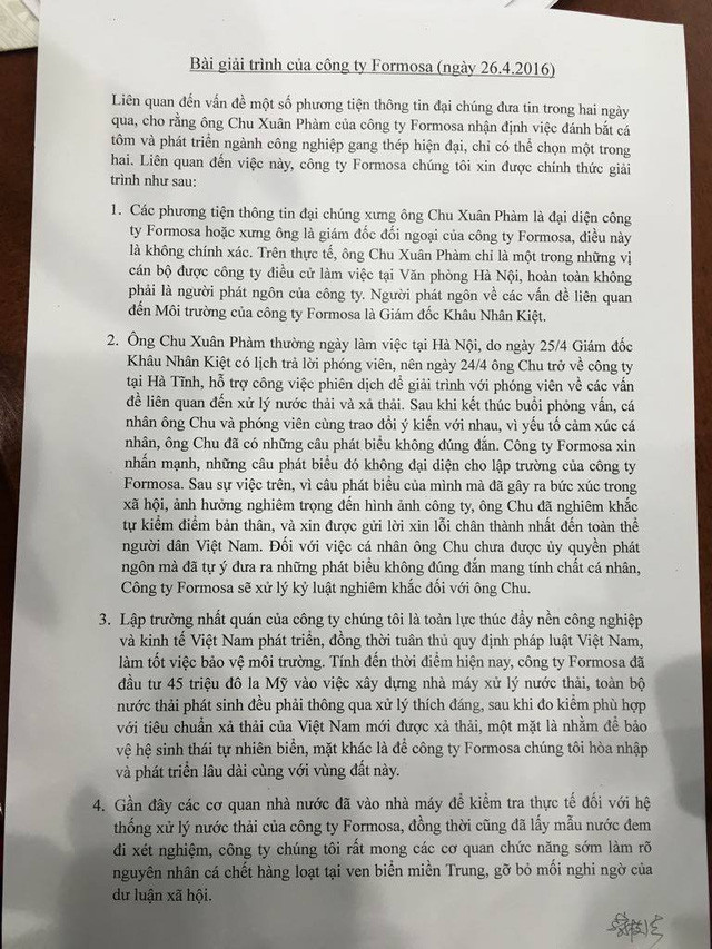 Khoảng 15h30, Công ty TNHH Gang thép Hưng Nghiệp Formosa Hà Tĩnh đã tổ chức buổi họp báo chính thức giải trình về phát ngôn gây sốc của ông Chu Xuân Phàm – Trưởng Văn phòng Formosa Hà Nội cũng như dư luận xung quanh việc liên quan giữa việc cá chết hàng loạt ở miền Trung với việc xả thải của công ty này.