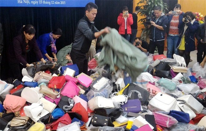 Tiêu hủy 1.234 sản phẩm thời trang các loại (túi xách, ví da, giày…) giả mạo nhãn hiệu Charles&Keith, Pedro đang được bảo hộ tại Việt Nam. (Ảnh: T.H/Vietnam+)