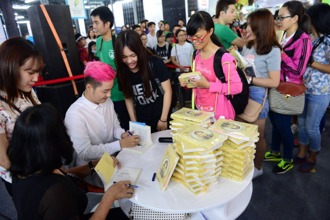 Ca sĩ Thanh Duy Idol ký tặng sách Lỗi ở yêu thương về nhà với mẹ tại Hội sách TP.HCM 2016 - Ảnh: Quang Định