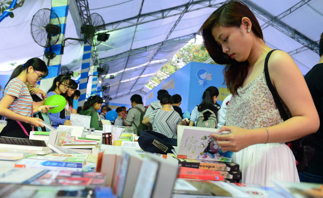 bạn trẻ chọn mua sách tại hội sách TP.HCM 2016. -Ảnh: Quang Định.