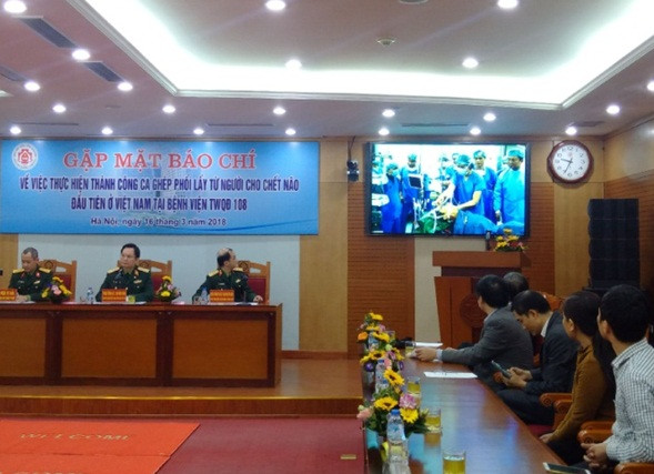 Hình ảnh toàn cảnh buổi gặp mặt báo chí.Ngày 26/2/2018 tại Bệnh viện Trung ương Quân đội 108, ca ghép phổi lấy từ người cho chết não đầu tiên ở Việt Nam được thực hiện dưới sự chỉ đạo của GS.TS. Mai Hồng Bàng, Giám đốc Bệnh viện Trung ương Quân đội 108, cùng tham gia thực hiện có hơn 60 thầy thuốc và nhân viên y tế của Bệnh viện Trung ương Quân đội 108, một số thầy thuốc của Bệnh viện Việt Đức, Bệnh viện Chợ Rẫy và sự hỗ trợ của 3 chuyên gia y tế đến từ Cộng hòa Pháp và Vương quốc Bỉ.