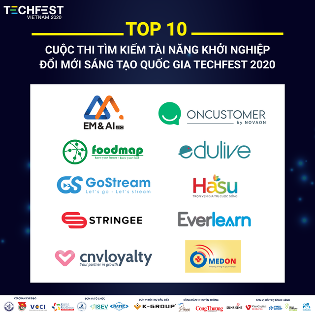 Top 10 vào Chung kết Techfest 2020 bao gồm: Foodmap (công nghệ ẩm thực); Gostream (nền tảng livestream); Stringee (công nghệ giao tiếp); Med-on (công nghệ y tế); MVV Everlearn (công nghệ giáo dục) ; OnCustomer (nền tảng giao tiếp khách hàng); EM&AI (công nghệ trí tuệ nhân tạo); Edulive (công nghệ giáo dục) ; CNV Loyalty (chăm sóc khách hàng); HASU Toàn Cầu (nền tảng ứng dụng sức khỏe, học tập, giải trí cho người lớn).