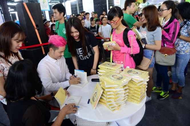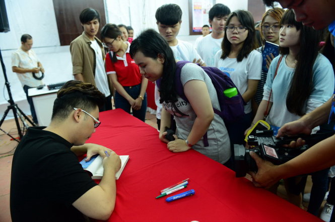 Tác giả Hamlet Trương ký tặng sách 12 cách yêu cho độc giả tại Hội sách TP.HCM tối 21-3 - Ảnh: Quang Định