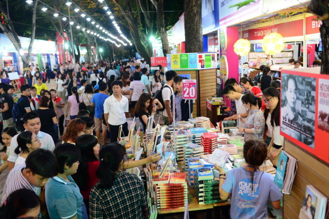 Hàng ngàn độc giả đến Hội sách TP.HCM tối 21-3 tại công viên Lê Văn Tám, Q.1, TP.HCM - Ảnh: Quang Định