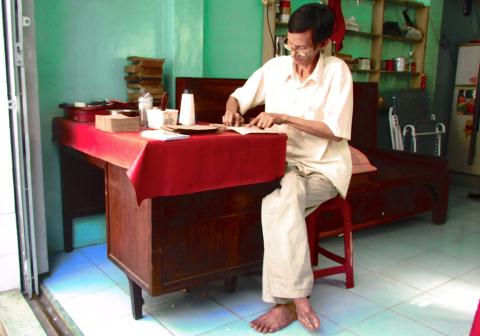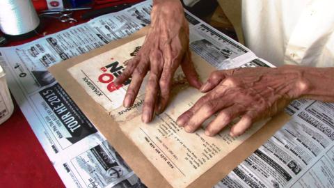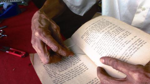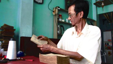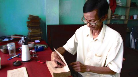 Mặc dù tuổi đã cao nhưng hằng ngày ông vẫn ngồi đó, cặm cuội phục chế cho từng cuốn sách như cố níu giữ hoài niệm xưa cũ.