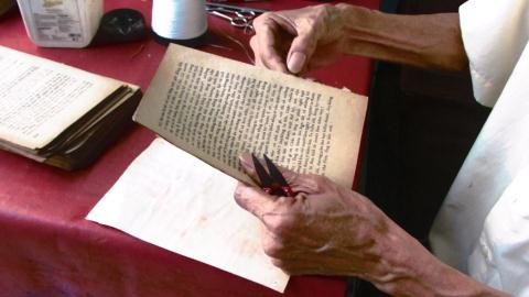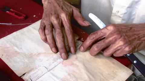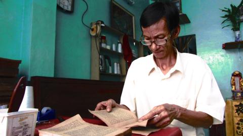 Tỉ mẩn như một nghệ sĩ điêu khắc, ông Rạng dùng cặp kính lão, soi qua một chiếc kính lúp vào những mảnh vụn của trang sách cũ, cẩn thận dùng nhíp gắp từng mảnh và đính lại với nhau.