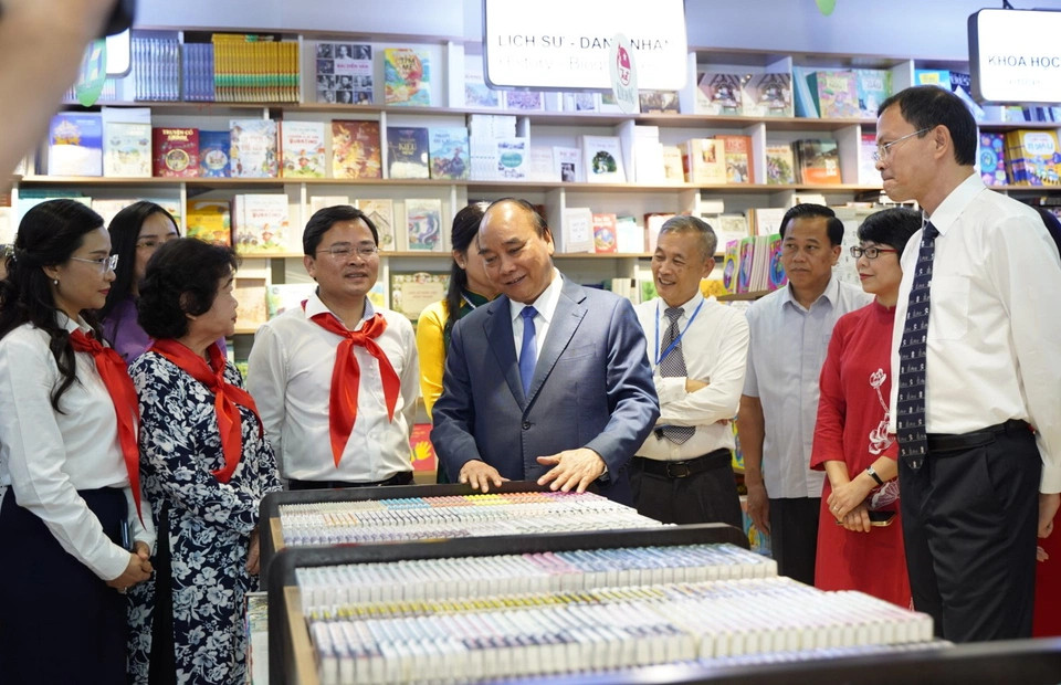 Chủ tịch nước Nguyễn Xuân Phúc tham quan các ấn phẩm của Nhà xuất bản Kim Đồng chiều 17/6. Ảnh: K.Đ.