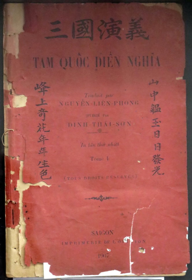 TTO - Quyển Tam quốc diễn nghĩa chữ quốc ngữ sớm nhất tại Việt Nam do Nguyễn Liên Phong dịch, ấn hành năm 1907 vừa được trưng bày đặc biệt tại nhà sách Cá Chép (223 Nguyễn Thị Minh Khai - Q1) từ ngày 9-4.