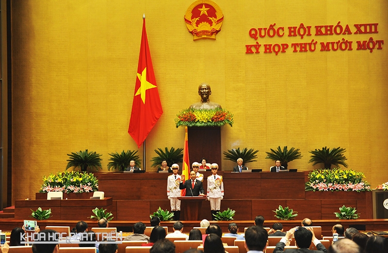 Tân Thủ tướng Nguyễn Xuân Phúc thực hiện nghi lễ tuyên thệ ngay sau khi Quốc hội bỏ phiếu thông qua Nghị quyết công nhận kết quả. Ảnh: NY.