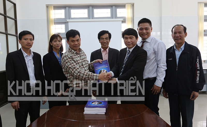 Lãnh đạo Cục Năng lượng nguyên tử Việt Nam tặng sách tại Đại học Đà Lạt. Cuốn sách là tập hợp những tư liệu quý được tập hợp để các đơn vị nghiên cứu tham khảo. Ảnh: MH.