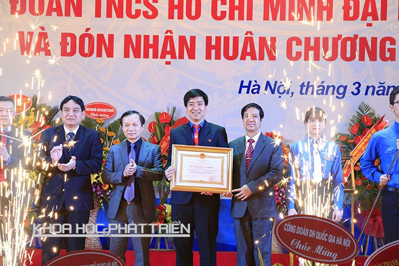 TS Trương Ngọc Kiểm đón nhận Huân chương Lao động hạng Nhì dành cho các thế hệ cán bộ đoàn, đoàn viên, thanh niên của ĐHQGHN trong 20 năm qua. Ảnh chụp tháng 3/2016. Ảnh: NVCC