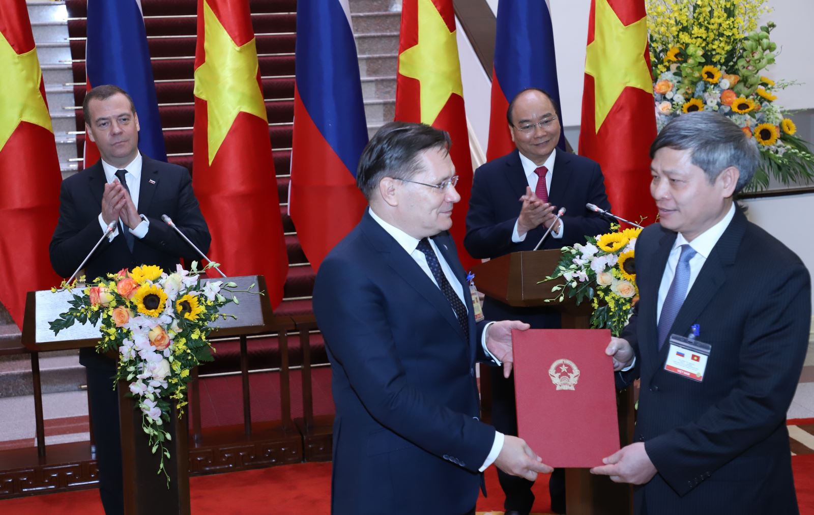 Ngày 19/11, tại Văn phòng Chính phủ, Thủ tướng Nguyễn Xuân Phúc đã hội đàm với Thủ tướng Liên bang Nga D.A. Medvedev. Thủ tướng Nguyễn Xuân Phúc và Thủ tướng D.A. Medvedev nhất trí thúc đẩy các dự án hợp tác quy mô trọng điểm trên các lĩnh vực năng lượng, công nghiệp, giao thông vận tải, nông nghiệp, đồng thời mở rộng hợp tác sang các lĩnh vực thông tin, công nghệ số, chính phủ điện tử; khẳng định quyết tâm triển khai dự án Trung tâm Khoa học Công nghệ hạt nhân tại Việt Nam trị giá 350 triệu USD.