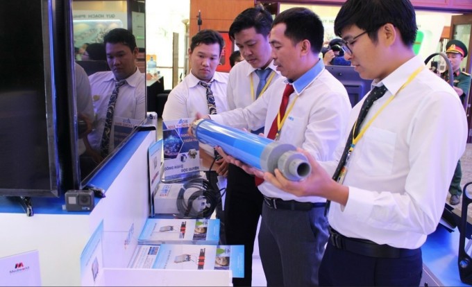 Kỹ sư Lê Trung Hiếu (cà vạt đỏ) giới thiệu sản phẩm xử lý cáu cặn trên ống nước ở một triển lãm tại TP HCM năm 2020. Ảnh: NVCC