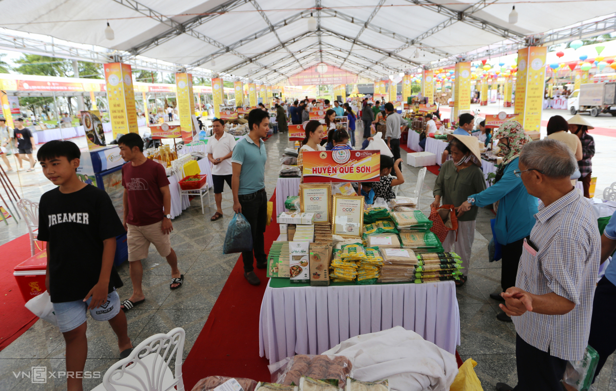 Trong ảnh là khách đến tham quan gian hàng mua bánh tráng, phở sắn đến từ huyện Quế Sơn, Quảng Nam trưng bày. Đây là sản phẩm khởi nghiệp được tỉnh công nhận OCOP (chương trình quốc gia mỗi xã một sản phẩm).