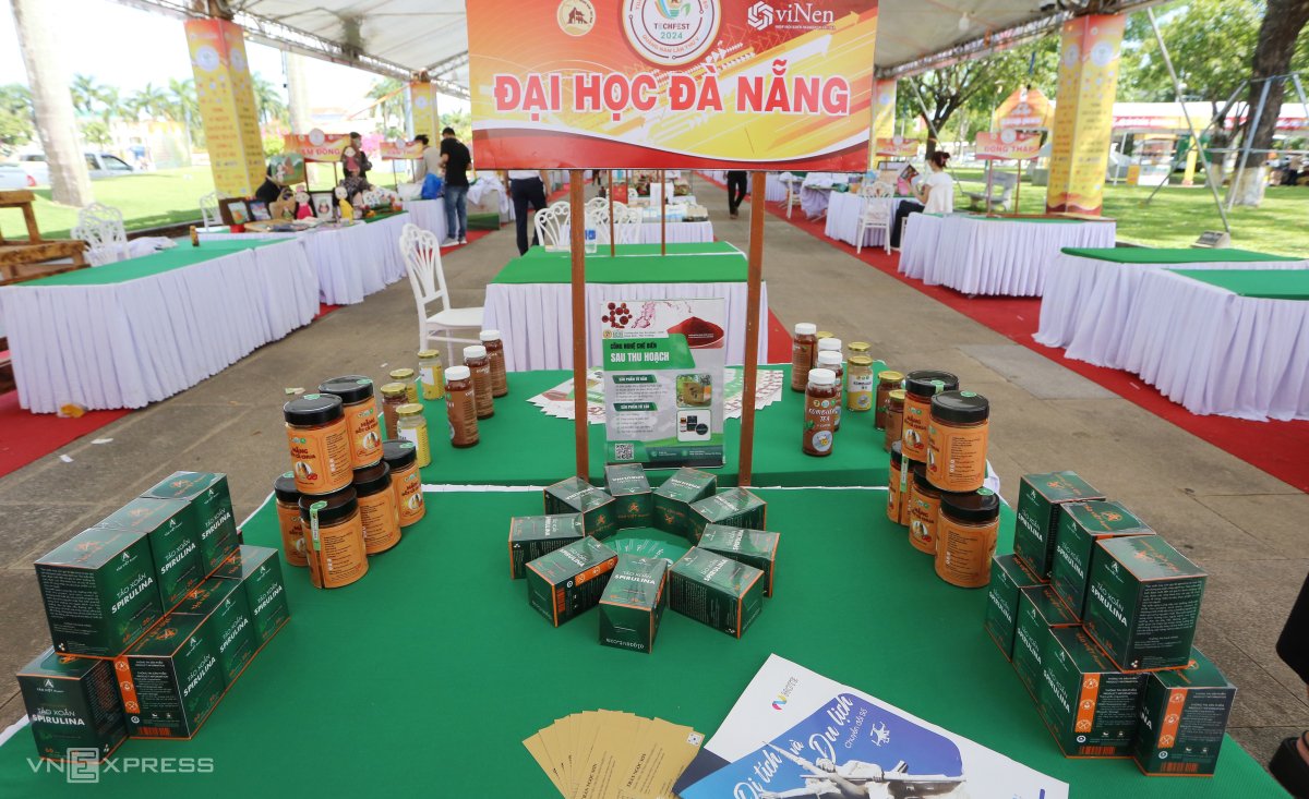 Gian trưng bày sản phẩm Tảo xoắn Spirulina, Đại học Đà Nẵng. Đây là sản phẩm giàu protein, vitamin, khoáng chất cung cấp năng lượng tối đa cho cơ thể, hỗ trợ sức khỏe tốt. Tảo có dưỡng chất phycocyanin giúp ngăn ngừa và hỗ trợ điều trị cho bệnh nhân ung thư.