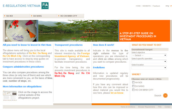 Trang web quy định điện tử Việt Nam (www.vietnam.e-regulations.org) được công bố chính thức ngày 8/11 với sự hợp tác của Cục Đầu tư nước ngoài (Bộ Kế hoạch và Đầu tư) và Diễn đàn Thương mại và Phát triển Liên hiệp quốc (UNCTAD).