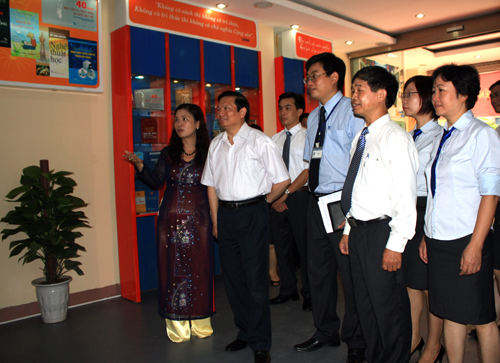 Giám đốc Nhà xuất bản TT&TT đang giới thiệu với Bộ trưởng về logo mới của Nhà xuất bản |