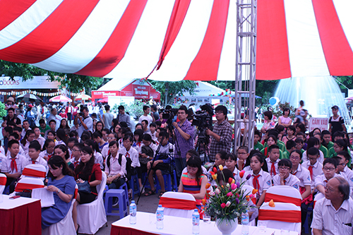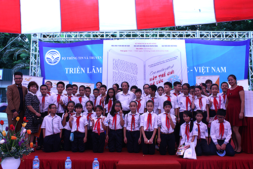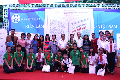 Bà Nguyễn Thị Thu Hà – Giám đốc, Tổng Biên tập NXB TT&TT; Nhà viết kịch Vũ Quang Vinh - nguyên TBT Báo Thiếu niên Tiền phong; ông Nguyễn Quốc Vinh – Thành viên HĐTV Tổng công ty Bưu điện Việt Nam đang giao lưu cùng các bạn học sinh và các thầy cô giáo
