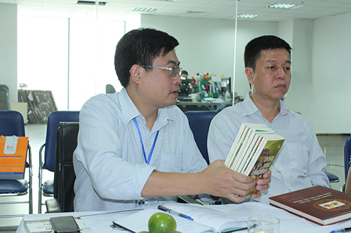 Ông Trần Chí Đạt – Giám đốc, Tổng biên tập NXB TT&TT đang giới thiệu một số cuốn sách của NXB với đoàn công tác