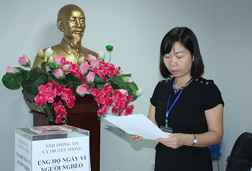 Thay mặt Lãnh đạo Chuyên môn và Công đoàn NXB; đồng chí Ngô Thị Mỹ Hạnh - Phó Giám đốc, Phó Tổng biên tập, Chủ tịch Công đoàn NXB đã phát động toàn thể cán bộ, viên chức và người lao động của NXB quyên góp ủng hộ “Ngày vì người nghèo” và các hoạt động an sinh xã hội năm 2016 bằng hình thức quyên góp tối thiểu một ngày lương đối với cán bộ, viên chức và người lao động của NXB, đồng thời nhắn tin ủng hộ trên Cổng thông tin điện tử nhân đạo quốc gia 1409.