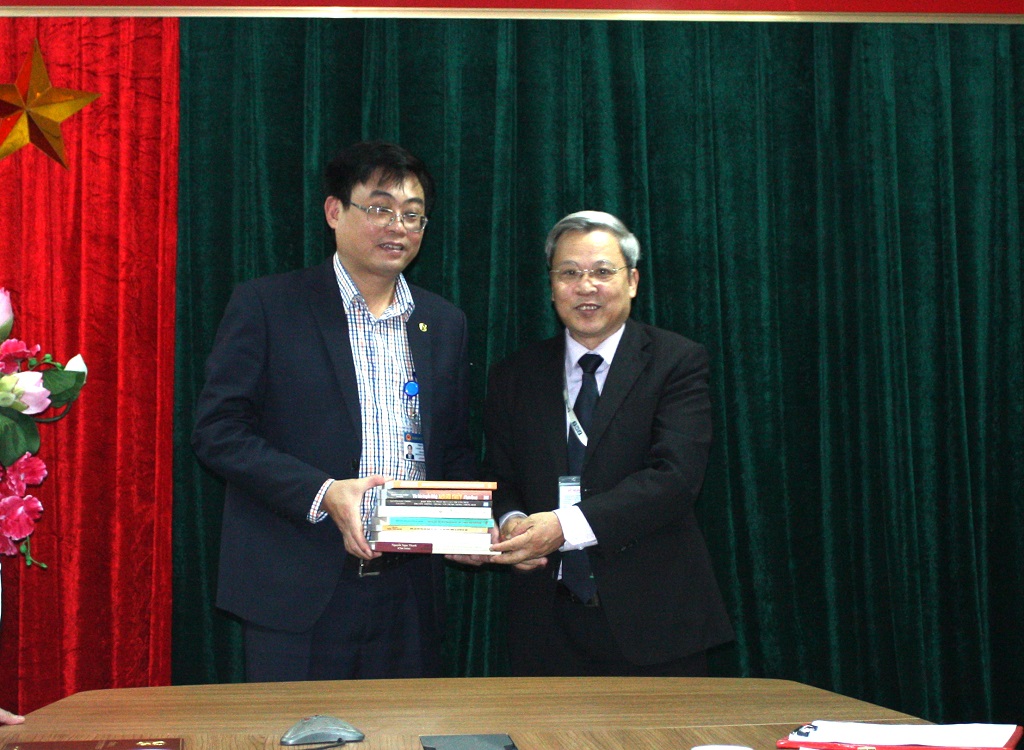 PGS. TS. Nguyễn Ngọc Thanh – Giám đốc Trung tâm Thông tin văn hóa các dân tộc (bên phải) trao tặng một số ấn phẩm của Trung tâm cho đồng chí Trần Chí Đạt – Giám đốc, Tổng Biên tập NXB TT&TT