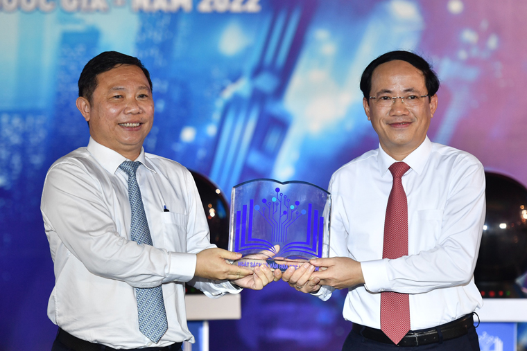 Phó Chủ tịch UBND TP. HCM Dương Anh Đức trao tặng biểu trưng Ngày Sách và Văn hóa đọc Việt Nam cho Thứ trưởng Phạm Anh Tuấn.