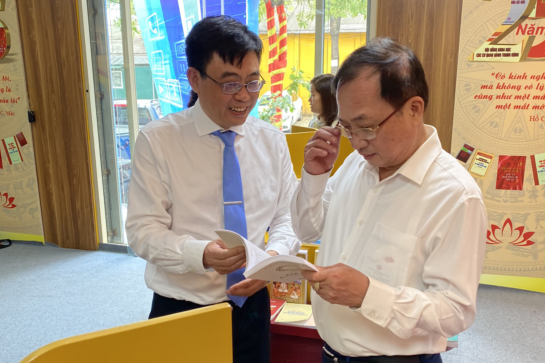 Giám đốc - Tổng Biên tập Nhà xuất bản Chính trị quốc gia Sự thật, PGS.TS. Phạm Minh Tuấn và Cục trưởng Cục Xuất bản, In và Phát hành Nguyễn Nguyên tại quầy trưng bày sách về Chuyển đổi số của Nhà xuất bản Thông tin và Truyền thông