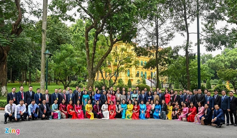 Đại biểu người làm xuất bản tiêu biểu chụp ảnh kỷ niệm trong khu di tích Chủ tịch Hồ Chí Minh.