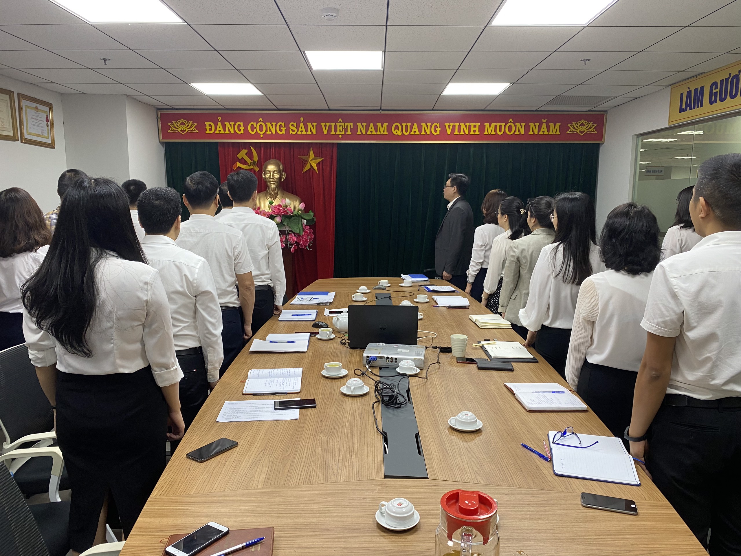 Lãnh đạo NXB TT&TT cùng toàn thể cán bộ viên chức NXB thực hiện nghi thức Chào cờ và hát Quốc ca