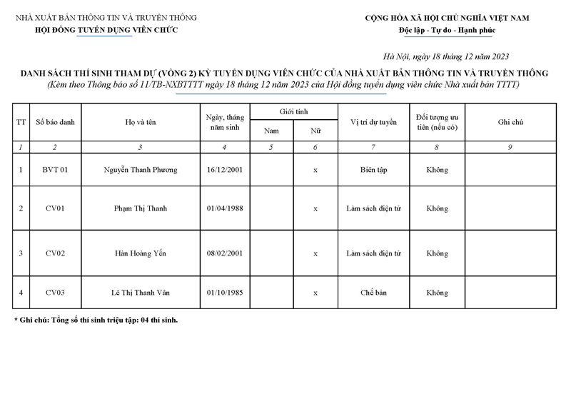 Thông báo Danh sách và triệu tập thí sinh đủ điều kiện, tiêu chuẩn tham dự thi tuyển viên chức Vòng 2 của Nhà xuất bản Thông tin và Truyền thông năm 2023