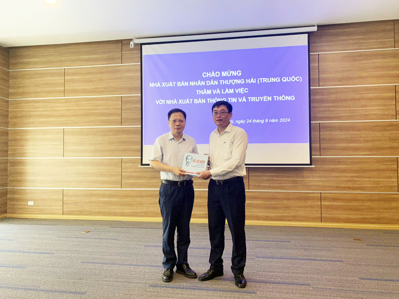 Ông Trần Chí Đạt - Giám đốc, Tổng Biên tập NXB TT&TT trao tặng và giới thiệu nội dung cuốn sách về Chủ tịch Hồ Chí Minh với ông Tôn Du - Phó Tổng Biên tập Nhà xuất bản Nhân dân Thượng Hải