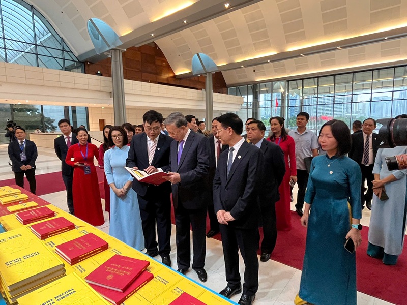Đồng chí Tô Lâm - Tổng Bí thư Ban Chấp hành Trung ương Đảng và đồng chí Nguyễn Mạnh Hùng - Bộ trưởng Bộ Khoa học và Công nghệ thăm gian trưng bày sách của Nhà xuất bản