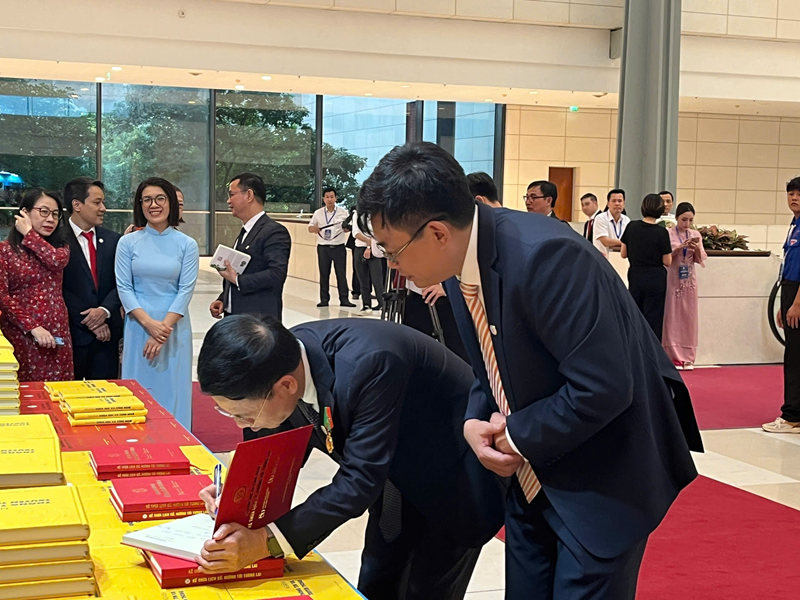 Đồng chí Nguyễn Mạnh Hùng - Bộ trưởng Bộ Khoa học và Công nghệ ký tặng sách Nhà xuất bản tại Lễ kỷ niệm