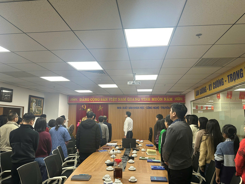 Sáng ngày 05/01/2026, trong ngày làm việc đầu tiên của năm mới, Nhà xuất bản Khoa học - Công nghệ - Truyền thông (NXB KH-CN-TT) đã tổ chức Lễ chào cờ và triển khai nhiệm vụ trọng tâm năm 2026. Đây là hoạt động thường kỳ được tổ chức vào đầu mỗi tháng, nhằm khơi dậy tinh thần yêu nước, nâng cao ý thức trách nhiệm và tăng cường sự đoàn kết trong toàn thể viên chức, người lao động của Nhà xuất bản. Buổi lễ được tổ chức trực tiếp tại trụ sở chính của Nhà xuất bản (tầng 6, tòa nhà 115 Trần Duy Hưng, phường Yên Hòa, TP. Hà Nội) và kết nối trực tuyến với các chi nhánh tại Thành phố Hồ Chí Minh và khu vực miền Trung - Tây Nguyên, bảo đảm sự tham dự đầy đủ, đồng bộ trong toàn hệ thống.