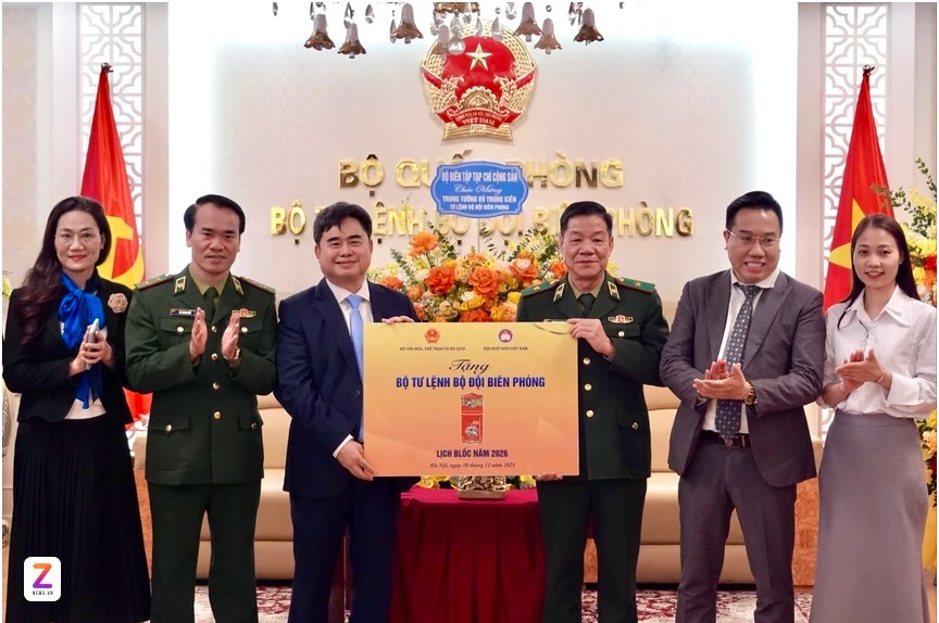 Đoàn đại biểu đã trao tặng lịch bàn năm 2026 cho Bộ Tư lệnh Bộ đội Biên phòng. Ảnh: Thụy An.