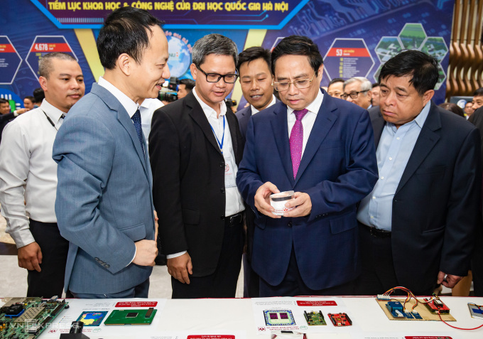 Thủ tướng Phạm Minh Chính (thứ hai từ phải sang) tham quan triển lãm sản phẩm vi mạch tại Đại học Quốc gia Hà Nội, cơ sở tại Khu CNC Hòa Lạc hồi tháng 4/2023. Ảnh:Tùng Đinh