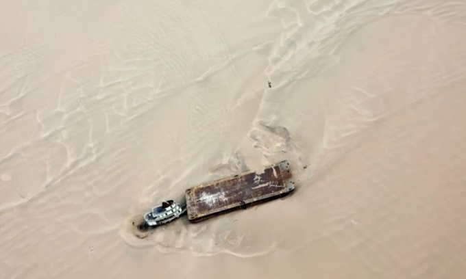 Một sà lan mắc cạn ở bờ cát của sông Solimões hôm 17/9. Ảnh: Reuters