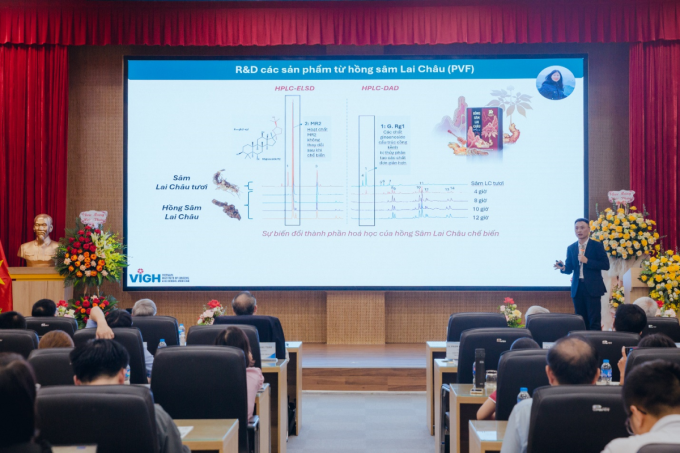 Tiến sĩ Phạm Hà Thanh Tùng - Viện trưởng Viện nghiên cứu Sâm và Dược liệu Việt Nam báo cáo tại Hội thảo khoa học "Tiêu chuẩn chất lượng dược liệu sâm và sản phẩm chăm sóc sức khỏe từ sâm". Ảnh: Vigh