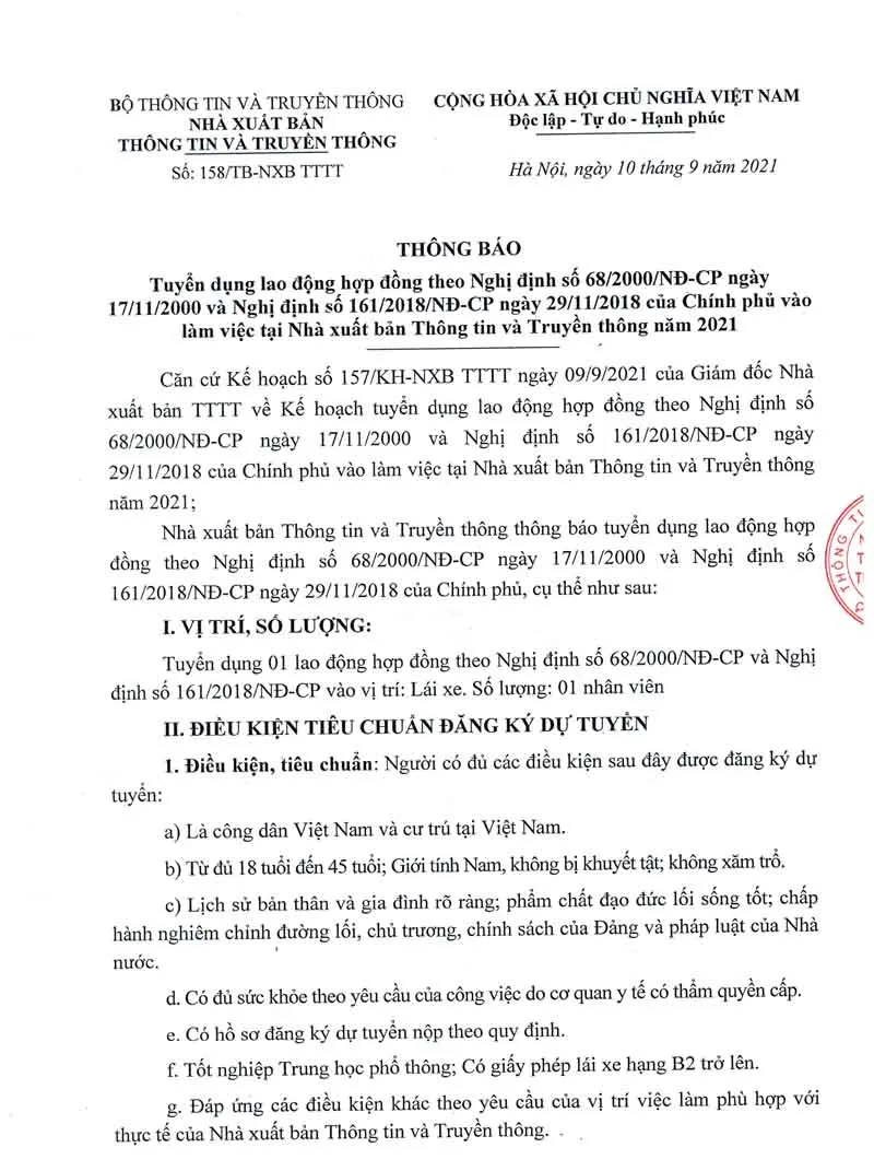 Tuyển dụng lao động hợp đồng theo Nghị định số 68/2000/NĐ-CP ngày 17/11/2000 và Nghị định số 161/2018/NĐ-CP ngày 29/11/2018 của Chính phủ vào làm việc tại Nhà xuất bản Thông tin và Truyền thông năm 2021