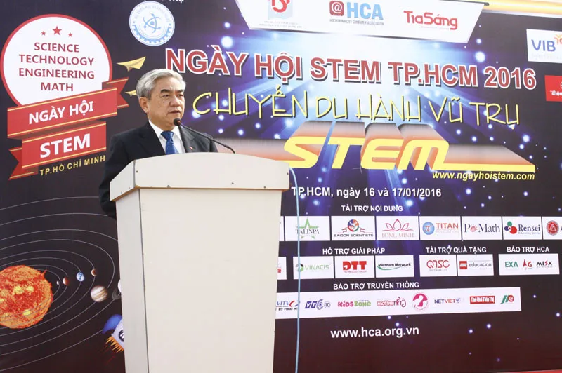 Ngày 16/1/2016, Ngày hội STEM TPHCM với chủ đề “Chuyến du hành vũ trụ STEM” được khai mạc và kéo dài trong hai ngày 16 – 17/1/2016 tại Trường Đại học Sài Gòn (237 An Dương Vương, Q5).Sự kiện do Hội tin học TPHCM, Trung tâm KH&CN trẻ Thành đoàn TPHCM và Tạp chí Tia Sáng (Bộ KH&CN) phối hợp tổ chức.Đây là hoạt động xã hội góp phần vào mục tiêu hỗ trợ thế hệ trẻ Việt Nam tiếp cận và thụ hưởng phương thức giáo dục hiện đại của thế giới, chuẩn bị nguồn lực cho tiến trình hội nhập toàn cầu của Việt Nam.Tại Ngày hội STEM, các em sẽ được thụ hưởng và trải nghiệm phương pháp giáo dục STEM miễn phí với các chủ đề: Khoa học sự sống, Khoa học vật liệu, công nghệ thông tin, công nghệ thực phẩm, toán trí tuệ, toán tư duy,&hellip.Qua cơ hội thực nghiệm, tương tác và tự tìm hiểu , học sinh sẽ tăng khả năng sáng tạo, cải tiến trên nền tảng kiến thức học được.Bên cạnh đó, học sinh còn được tham dự 20 TEM Show để tìm hiểu các kiến thức khoa học trong không khí sôi động và không gian nhiều màu sắc.Những phần trình diễn đặc sắc như biểu diễn mô hình máy bay, tìm hiểu về lực ly tâm, ghép tranh toán học, … giúp học sinh thoát khỏi cảm giác nhàm chán so với phương pháp chỉ được học lý thuyết ở các môn khoa học, công nghệ, kỹ thuật và toán học.Thông qua phương pháp học tập kết hợp thực nghiệm, trẻ em được rèn luyện khả năng tư duy logic, kỹ năng giải quyết vấn đề, làm việc nhóm, tập trung trong công việc,&hellip.Bộ trưởng Nguyễn Quân phát biểu tại Lễ Khai mạc ngày hội STEM TPHCM
