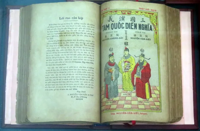 TTO - Quyển Tam quốc diễn nghĩa chữ quốc ngữ sớm nhất tại Việt Nam do Nguyễn Liên Phong dịch, ấn hành năm 1907 vừa được trưng bày đặc biệt tại nhà sách Cá Chép (223 Nguyễn Thị Minh Khai - Q1) từ ngày 9-4.Quyển Tam Quốc diễn nghĩa do Nguyễn Liên Phong dịch, in năm 1907, tại triển lãm - Ảnh: L.Điền