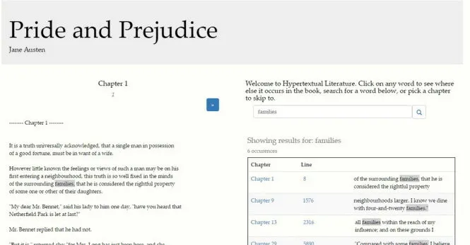 TTO - Từ ý tưởng người ta hoàn toàn có thể phân tích văn chương theo phương pháp siêu văn bản, nhóm tác giả Noah Eisen và Robert Rose hợp tác xây dựng trang web có tên Hypertext Library (Thư viện siêu văn bản) dành cho người mê sách.Trong chương 1 cuốn Kiêu hãnh và định kiến của Jane Austen, chúng tôi thử bấm vào chữ “families” ở dòng thứ 5, ngay lập tức ở bên phải hiện ra các ngữ cảnh khác cũng xuất hiện từ này như ở dòng 8 chương 1, dòng 1576 chương 9, dòng 2316 chương 13, dòng 5890 chương 29… - Ảnh: D.KIM THOA chụp lại từ màn hình